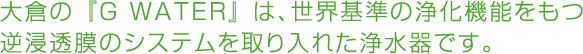 大倉の逆浸透膜浄水器『GWATER』(ジーウォーター)は、世界基準の浄化機能をもつ逆浸透膜のシステムを取り入れた浄水器です。
